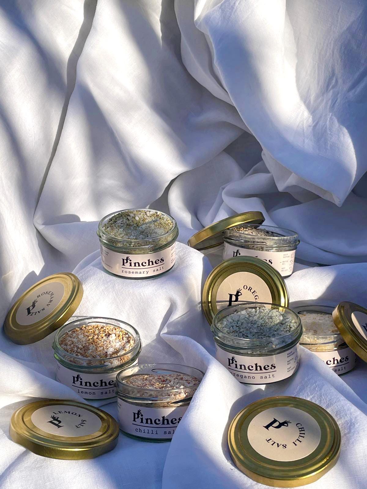 Our salts are made by carefully blending and balancing sea salt crystals with natural ingredients. Each of our different flavours are capable of lifting and enhancing your dishes whether you're cooking up something fancy or just making avo on toast! Our little jars are great to have on the go, too - going to the seaside? Take a chilli salt to sprinkle on your chip shop chips! Using a little Pinches salt is a simple but effective way to experiment with your food.